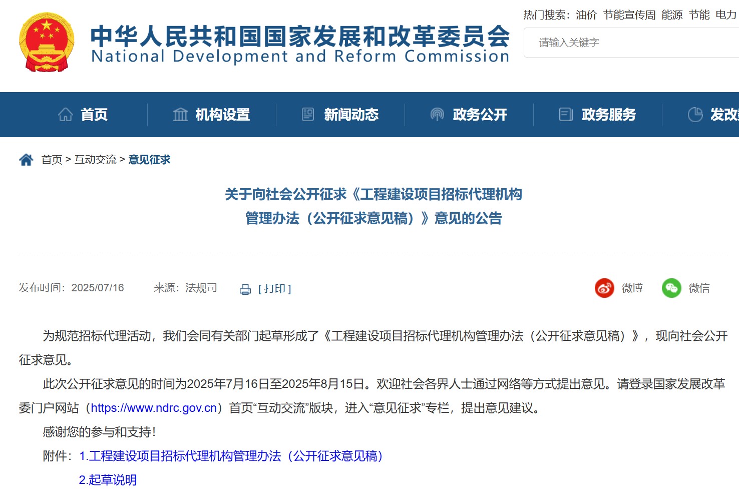 為規(guī)范招標(biāo)代理活動(dòng),國(guó)家發(fā)展和改革委員會(huì)會(huì)同有關(guān)部門起草形成了《工程建設(shè)項(xiàng)目招標(biāo)代理機(jī)構(gòu)管理辦法(公開(kāi)征求意見(jiàn)稿)》,現(xiàn)向社會(huì)公開(kāi)征求意見(jiàn)。此次公開(kāi)征求意見(jiàn)的時(shí)間為2025年7月16日至2025年8月15日。